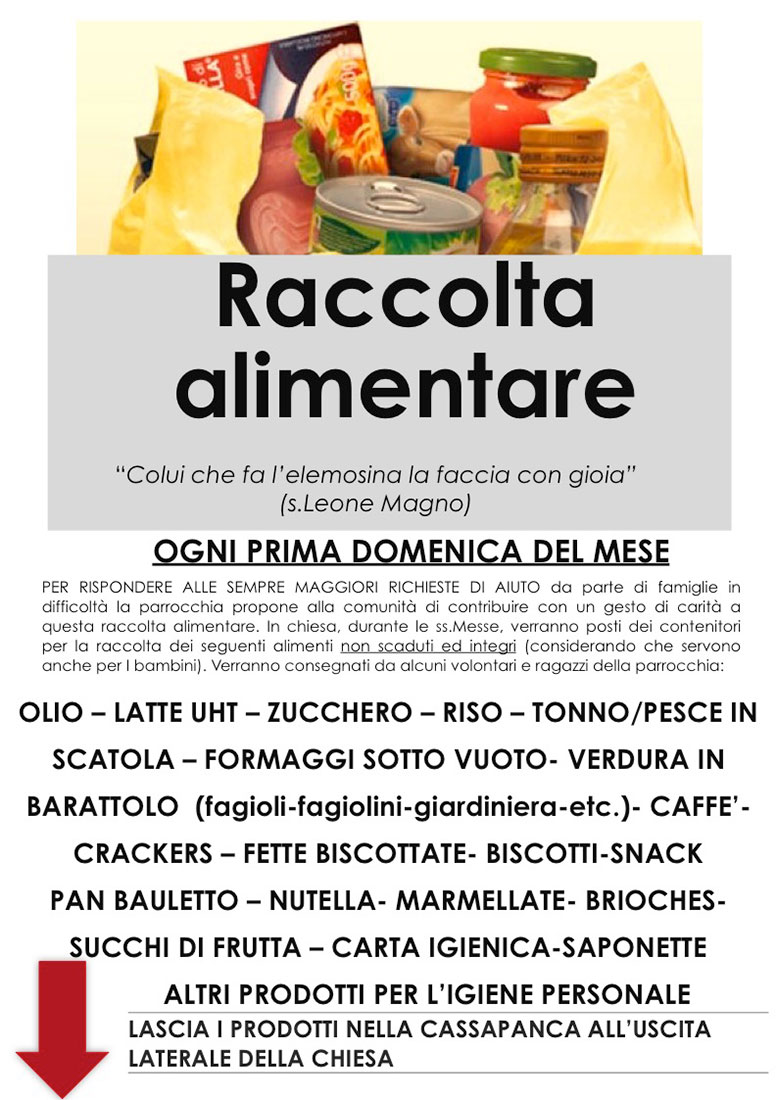 Come ogni mese anche nella prima domenica di ottobre si tiene la raccolta di generi alimentari per sostenere alcune famiglie della nostra parrocchia.