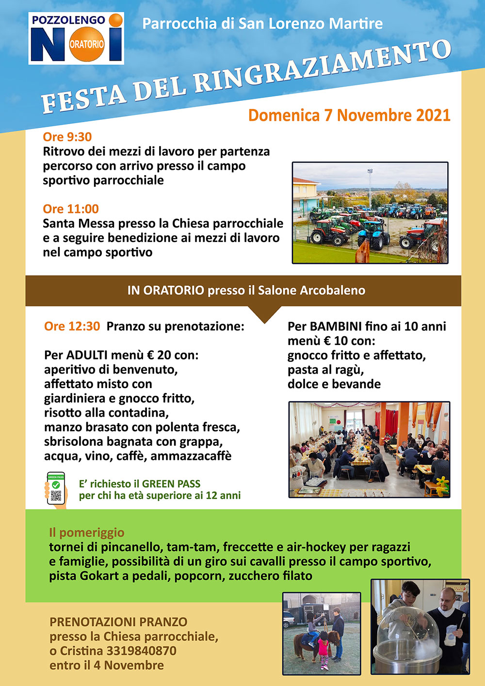 Finalmente in presenza possiamo celebrare la Festa del Ringraziamento il 7 novembre, una giornata per ringraziare il Creatore per i frutti della terra e tutti i suoi doni. Come ogni anno avremo la sfilata dei mezzi agricoli, la ss.Messa, il pranzo conviviale e tante altre attività per bambini, ragazzi e famiglie.