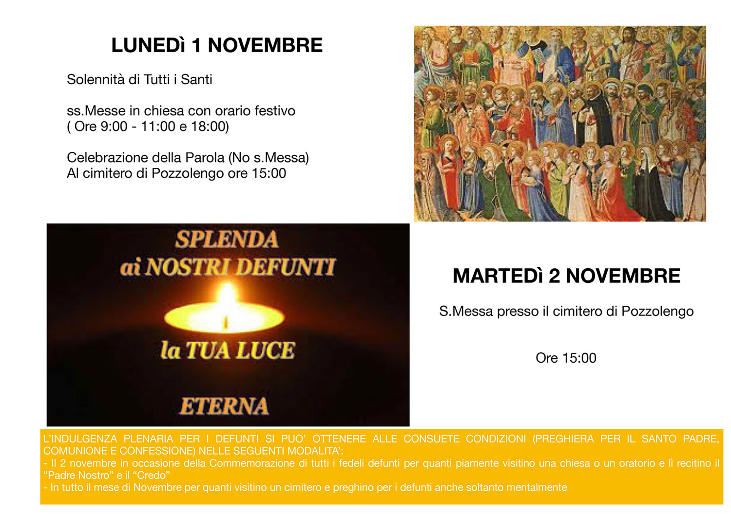 In occasione della solennità di tutti i Santi e della commemorazione dei fedeli defunti ecco nella locandina gli orari delle celebrazioni dei prossimi giorni.